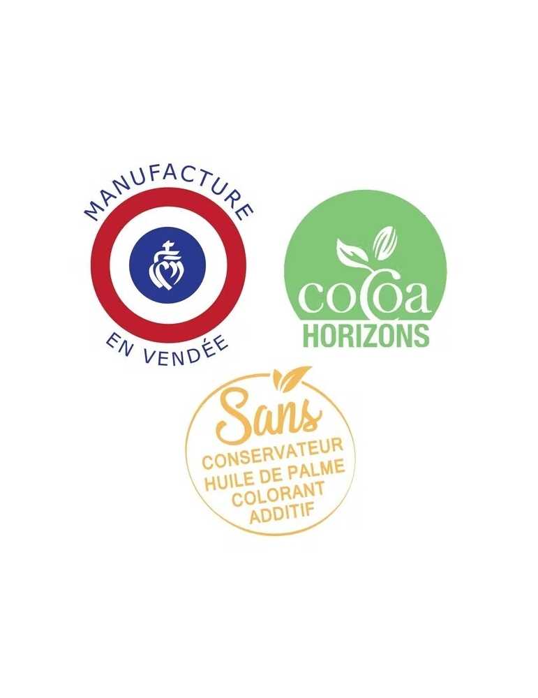 Noisetines : Chocolat noir - 42% - (pâte de cacao, sucre, beurre de cacao, émulsifiant : lécithine de SOJA), sucre - 32% -, NOISETTE - 25% - épaississant : gomme arabique, amidon de riz, arôme naturel de vanille avec autres arômes naturels. Traces possibles de : LAIT, AMANDE.