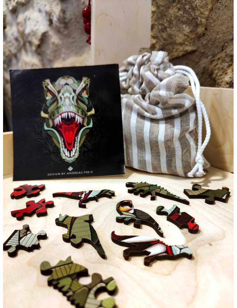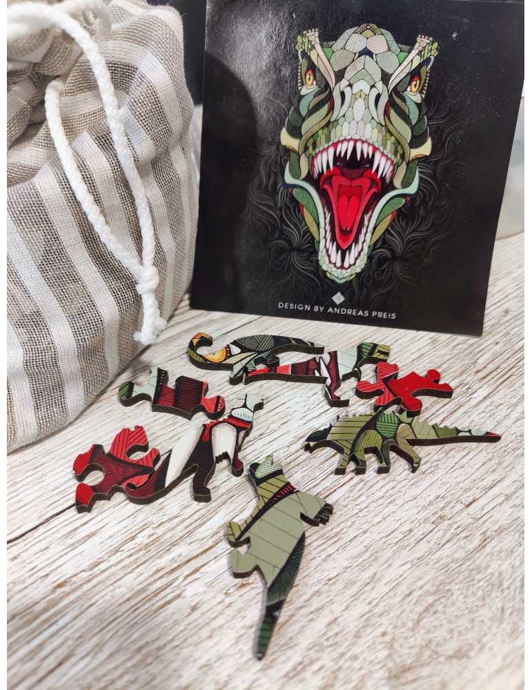 Un puzzle en bois T-Rex, avec des pièces en forme de dinosaures