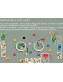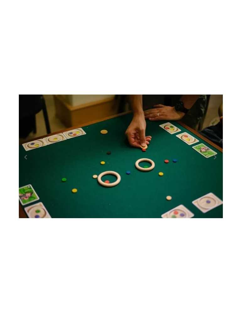 A mon tour de jeu, je fais sauter une puce à l’aide de mon lanceur, pour essayer de l’expédier dans l’un des deux anneaux placés sur la table. En faisant cela, si je réalise la combinaison de l’une de mes cartes Objectifs, alors je peux la retourner ; sinon rien ne se passe ! Ha, et si en faisant ceci je réalise la combinaison d’un autre joueur, alors il peut retourner a carte !