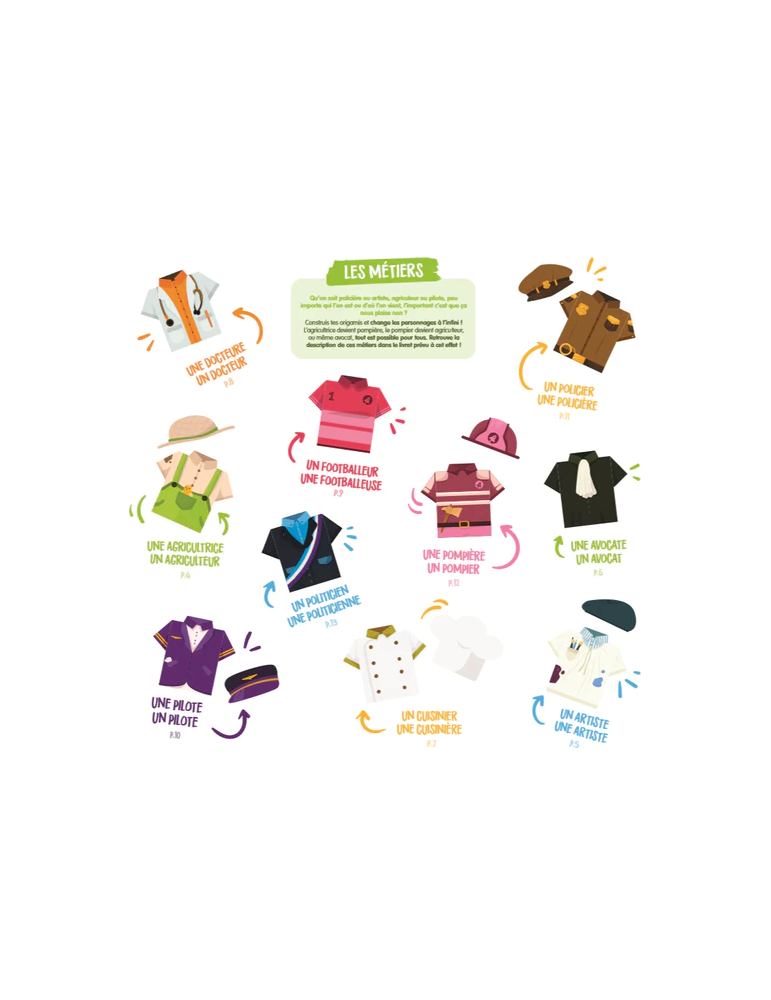 Fourni avec : une notice, tout le nécessaire pour réaliser les origamis, un livret découverte des métiers