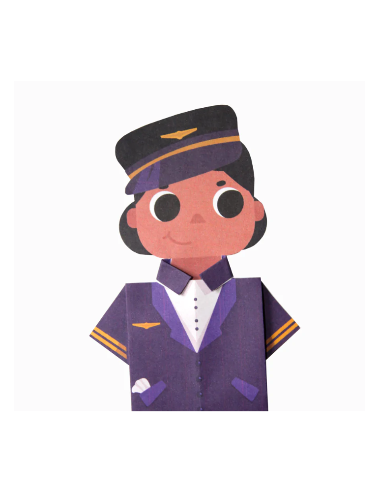 Fabriquer 10 figurines de métiers en origamis : crée tes 10 tes costumes de métiers en origamis et décide toi-même à qui ils correspondent ! Une pilote, un danseur, une avocate, un boulanger… Avec les 10 costumes et les 10 visages fournis, les possibilités sont infinies !