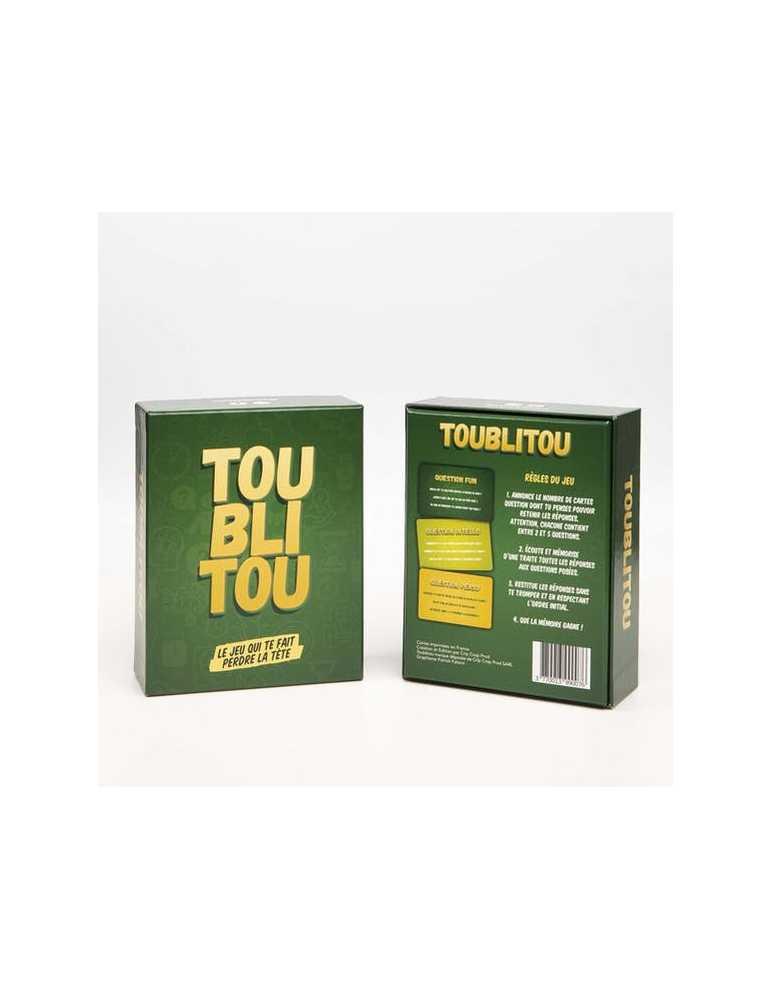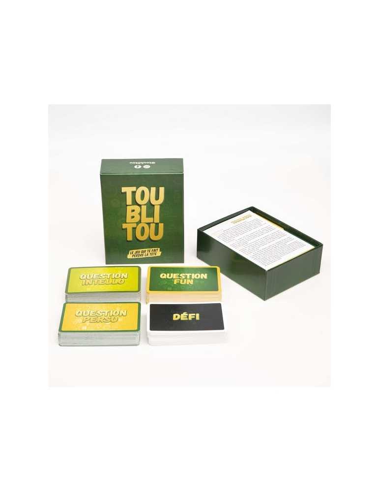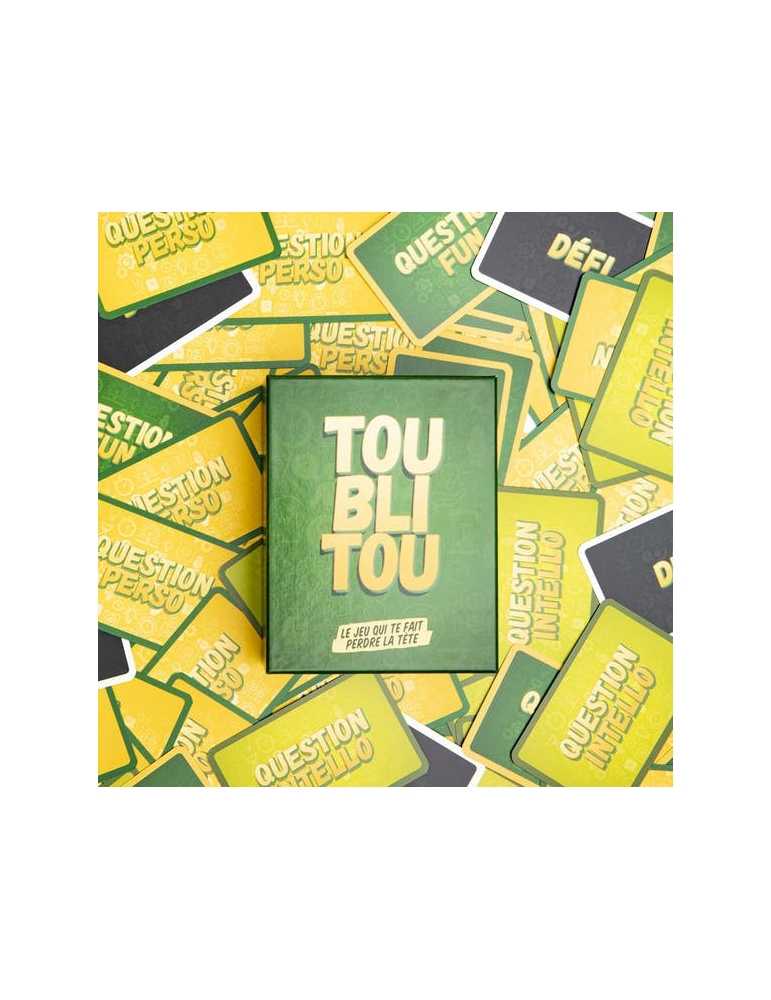 TOUBLITOU est le nouveau jeu de carte pour un apéro entre amis ou en famille qui te fait perdre la tête. Inspiré du Burger Quiz, le principe est simple : chaque joueur décide du nombre de cartes questions dont il devra retenir les réponses. Les thèmes varient entre questions fun, perso ou intello et attention aux cartes défis qui viennent corser le jeu !