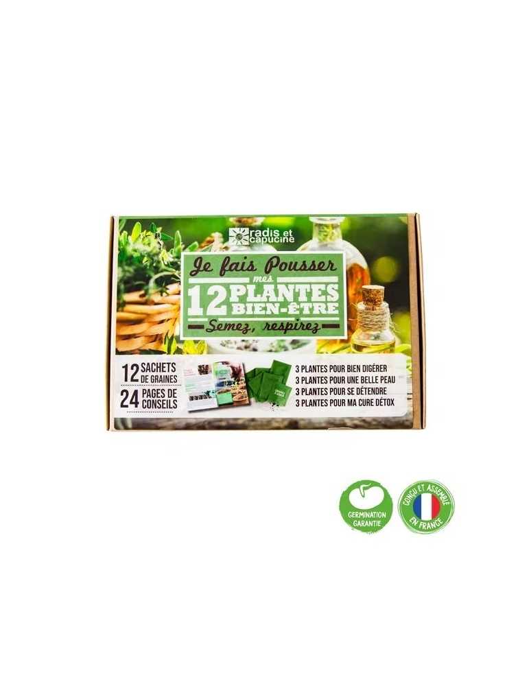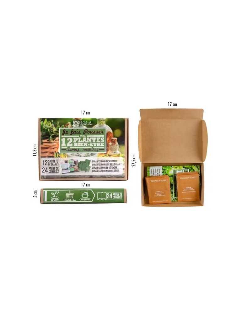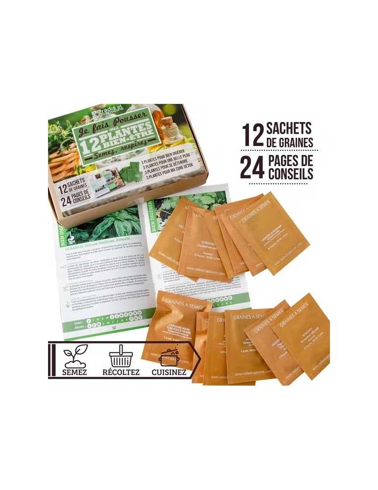 12 sachets de graines à semer, 24 pages de conseils et d'astuces