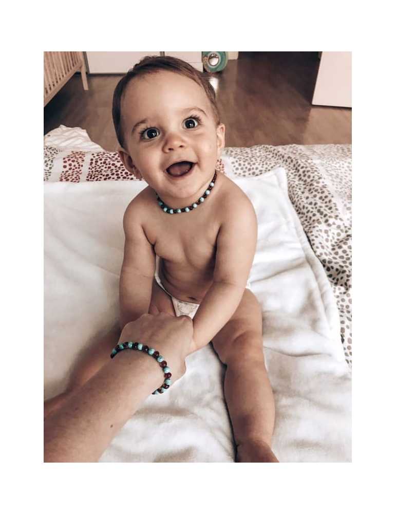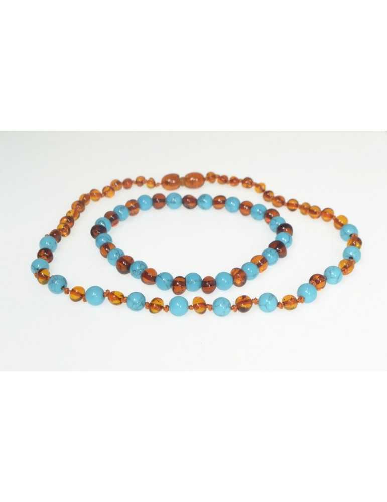 Collier bébé et bracelet maman - Ambre Cognac + turquoise