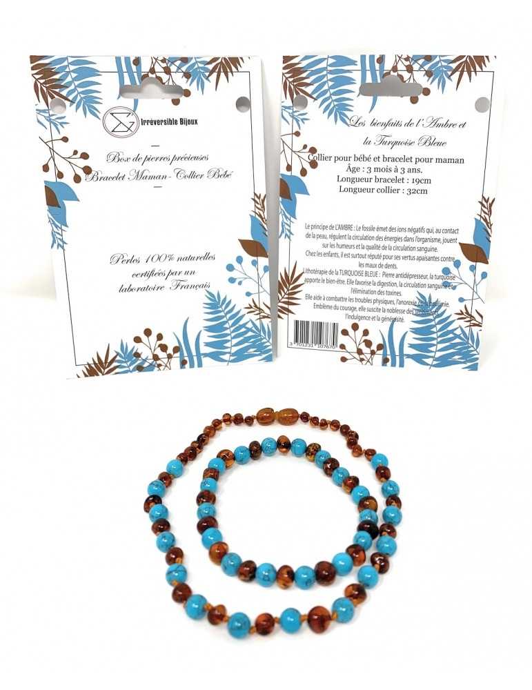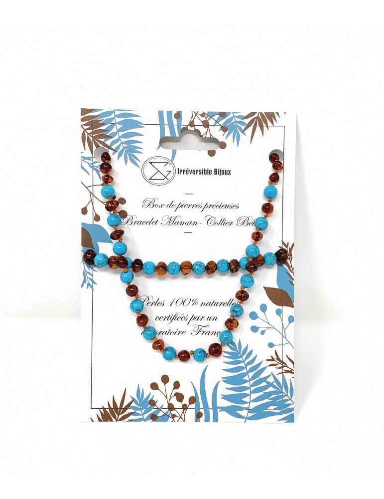 Coffret collier bébé + bracelet maman : ambre cognac + turquoise