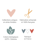 Les tissus sont sélectionnés avec soin, sans substances novices, pour garantir tout le confort nécessaire à bébé.