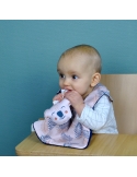 Ce grand bavoir bleu foncé à motifs feuillage rose est à la fois esthétique, efficace et confortable. Il est assez large pour protéger efficacement le haut et le pantalon du bébé des éclaboussures durant le repas.