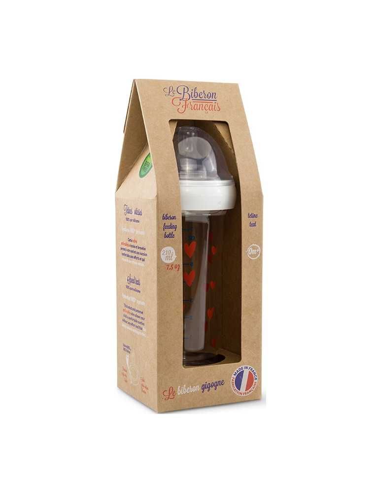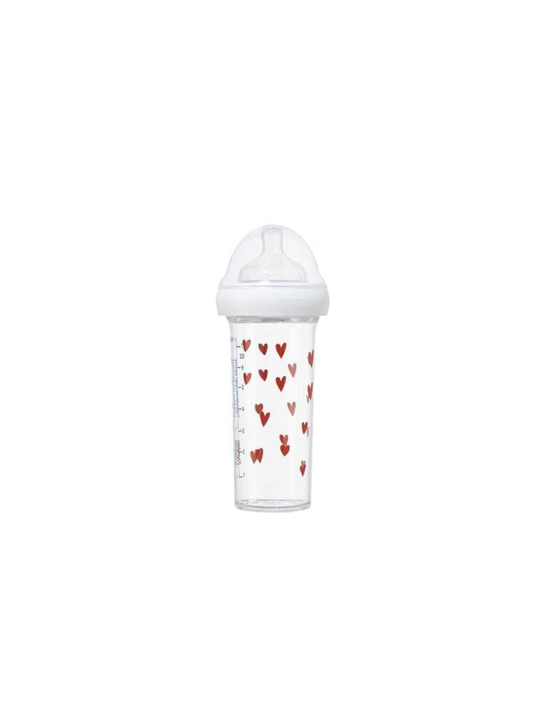 Ce biberon "Coeurs" de 210 ml pourtant très affiné permet d’accueillir jusqu’à 7 dosettes de lait en poudre, rapidement votre bébé aura plaisir à le saisir.