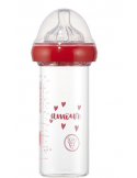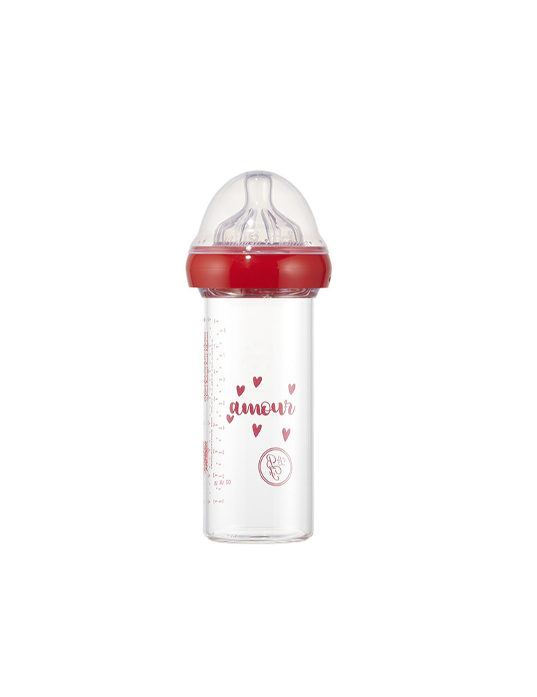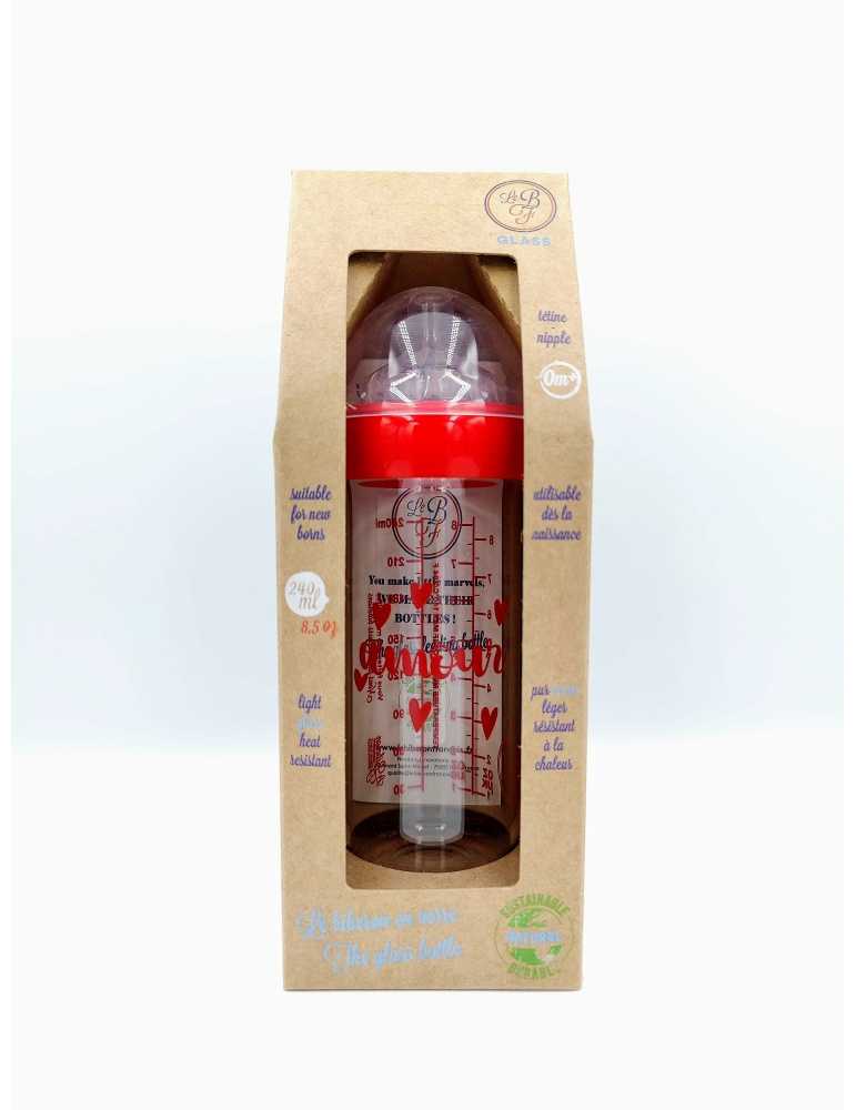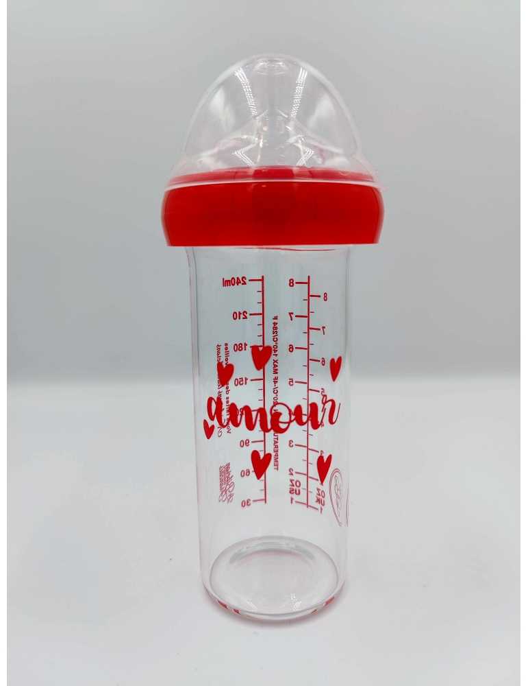 Ce biberon en verre "Amour " de 240 ml pourtant très affiné permet d’accueillir jusqu’à 8 dosettes de lait en poudre.