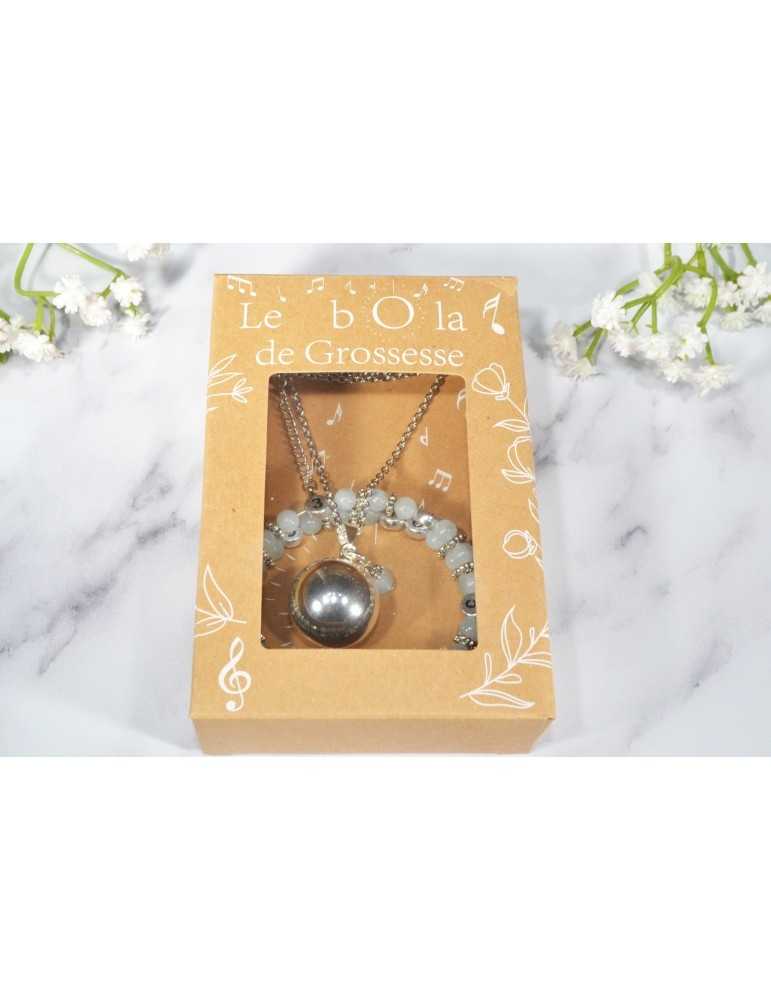 Contient un bola de grossesse lisse plaqué argent 18mm avec pendentif perle aigue marine et un bracelet d'allaitement en aigue marine avec le fonction horloge pour retenir la dernière tétée de bébé. Depuis son origine, le bola de grossesse est un bijou qui renferme une boule avec des petits grelots. Le bijou devient alors authentique et insolite, lorsque la maman le porte et au gré de ses mouvements partage avec son futur bébé le son mélodieux du bola qui repose sur son ventre arrondi. Le tintement du bola apaise et calme le bébé. Le collier de grossesse permet depuis des années à de nombreuses futures mamans, de créer un lien fort avec le bébé qui continue après la grossesse. En effet, il reconnaitra le doux son du bola après sa naissance.