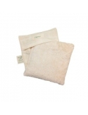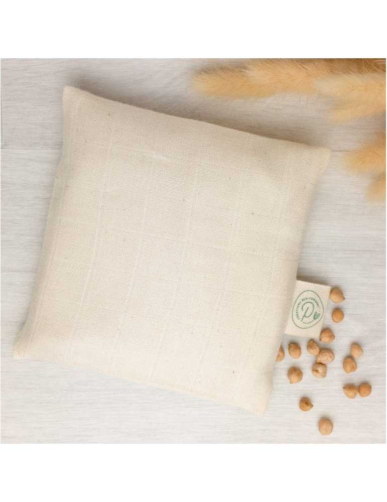 La bouillotte se compose d'une pochette amovible en sergé croisé de coton bio et d'un coussinet en éponge de coton bio rembourré de pois chiches.