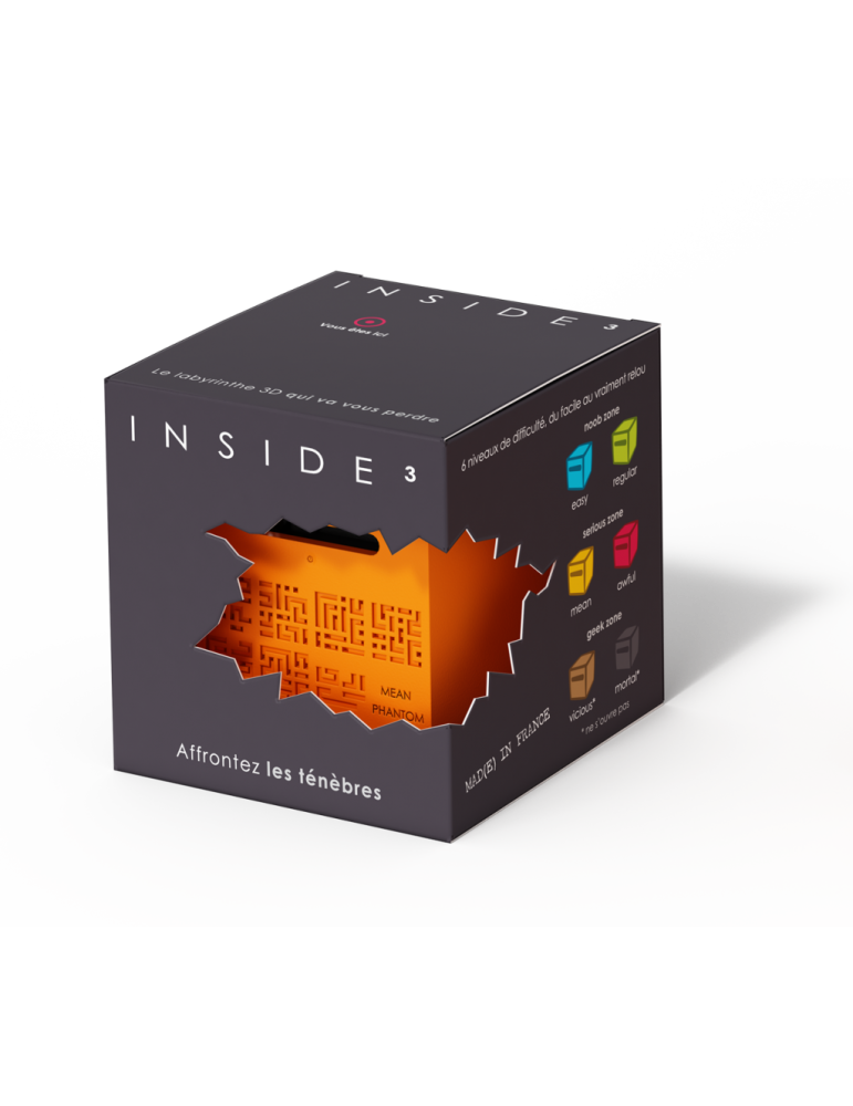 Inside3 c'est un labyrinthe caché à l'intérieur d'un cube. On joue à l'aveugle en s'aidant du plan gravé en surface.