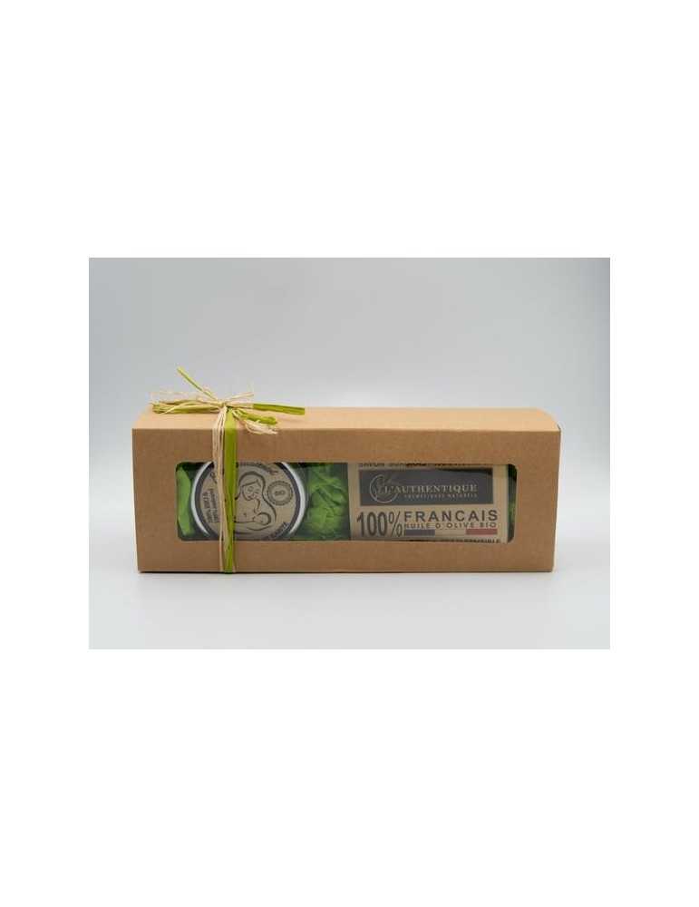 Coffret cadeau de Naissance comprenant 1 savon 100% Français (100 g, fait main) + 1 baume d'allaitement (50 ml, Pot en verre Recyclé à 90%)