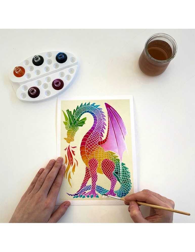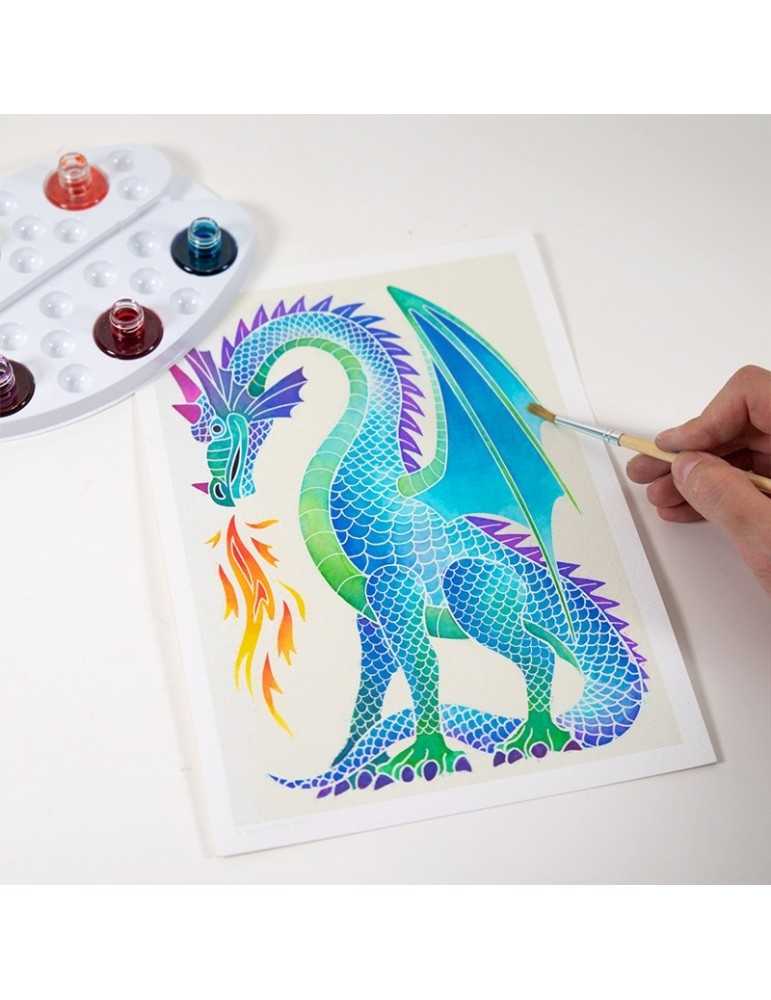 Profitez de ce coffret créatif et de ses encres aquarelles pour peindre, sans pouvoir dépasser, quatre somptueux dragons !