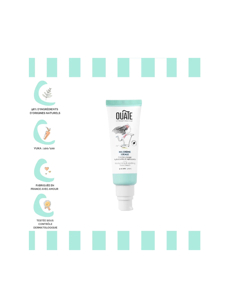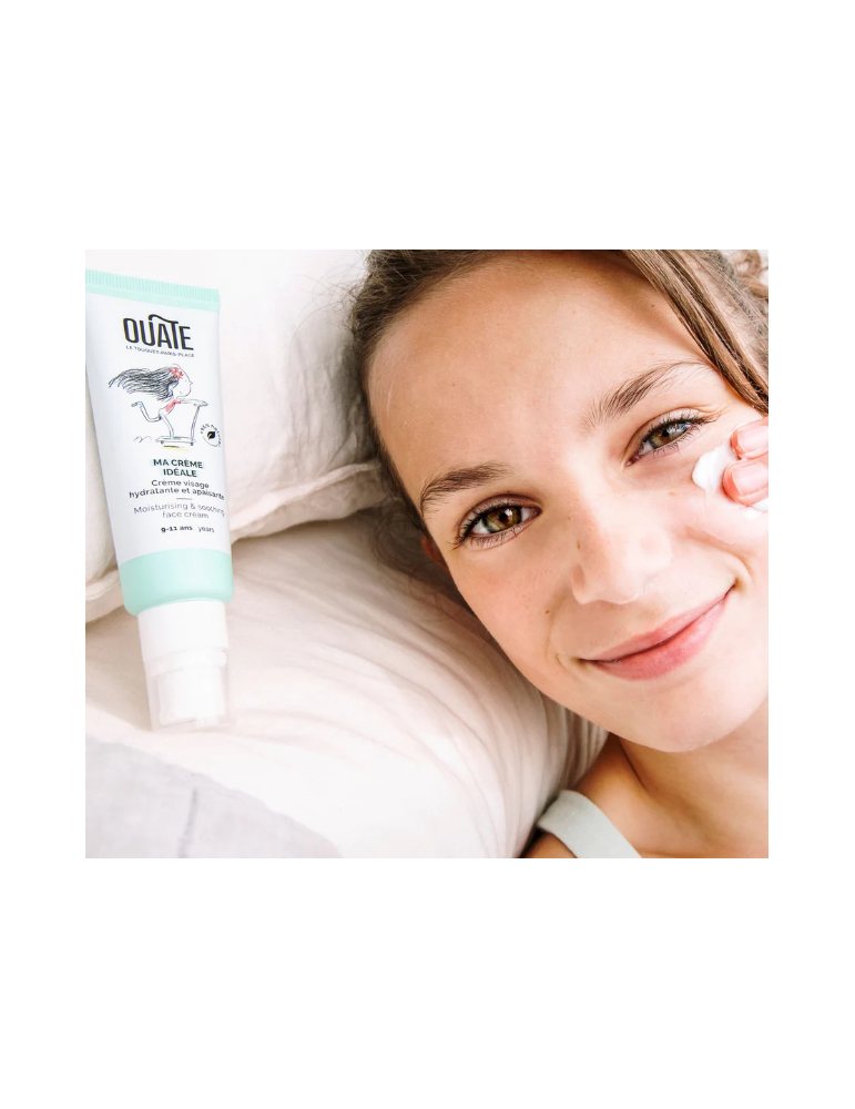 Ma Crème Idéale est une crème hydratante dont la formule naturelle nourrit et apaise la peau délicate du visage des jeunes filles de 9 à 11 ans.