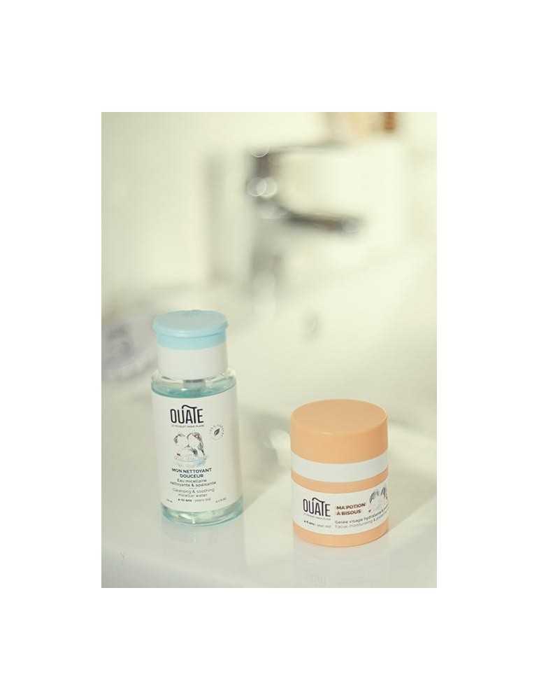 Contenance : soin visage Ma Potion à Bisous 30 ml + Mon Nettoyant Douceur 150 ml + boite à coton + carnet. Testé sous contrôle dermatologique et ophtalmologique Produits sans allergènes, sans paraben, sans MIT, sans CMIT, sans savon, sans huiles minérales, sans alcool, sans phtalates.