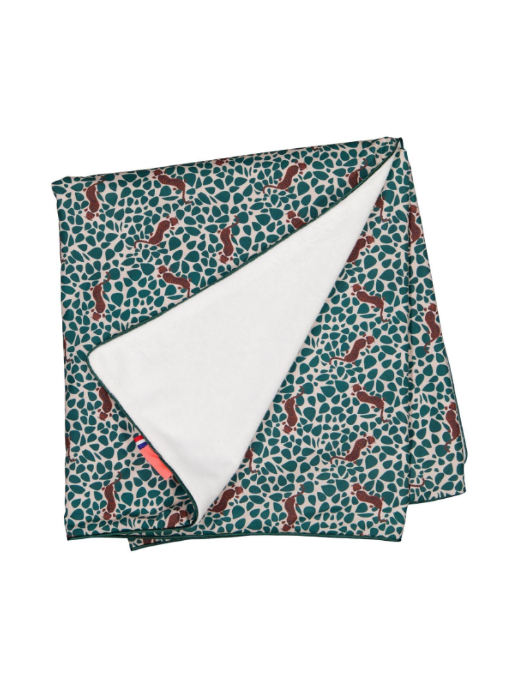 Au dos sa laine polaire rasée blanche toute douce apporte beaucoup de chaleur au bébé, devant notre joli tissu imprimé savane 100% coton.