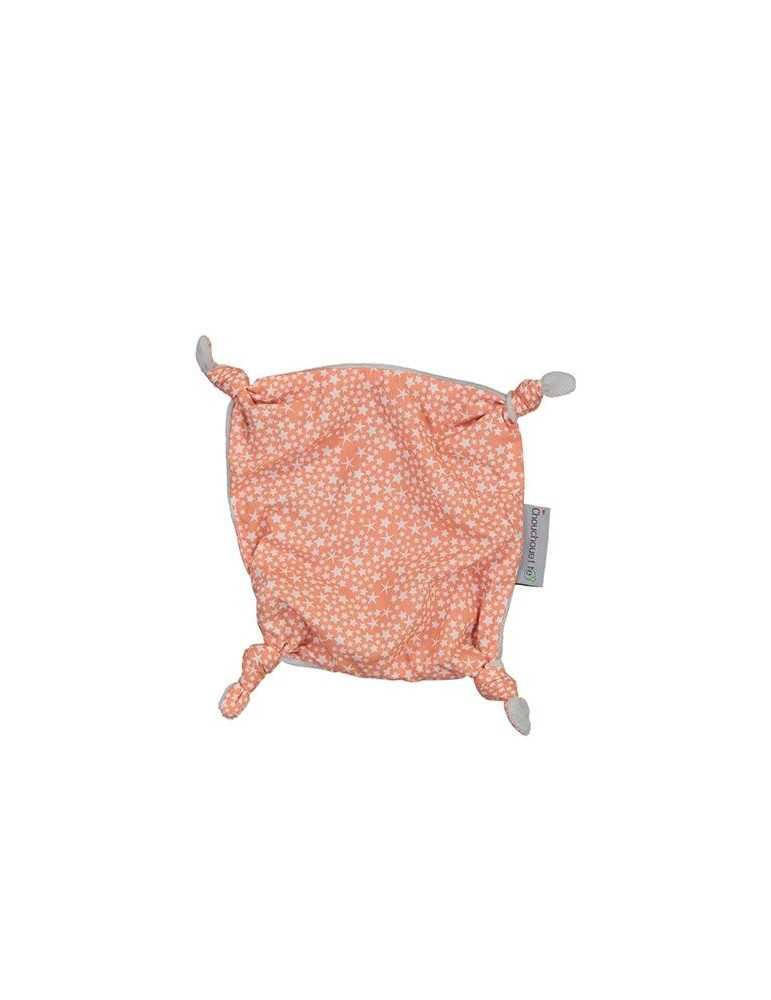 Ce doudou plat de couleur corail à motifs étoiles sera le compagnon idéal pour rassurer le bébé de jour comme de nuit. Fabriqué en tissu coton et en tissu doudou, il est léger et ultra doux au toucher. Votre bout de chou adorera jouer avec ses quatre petits nœuds.