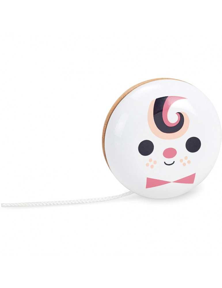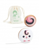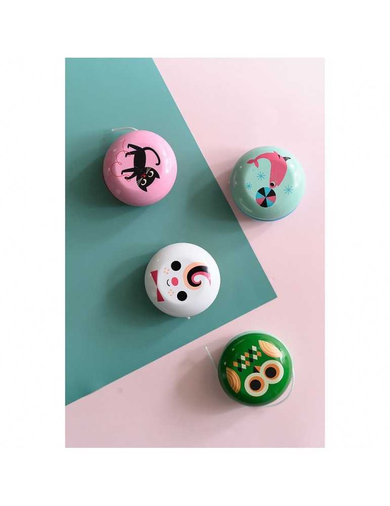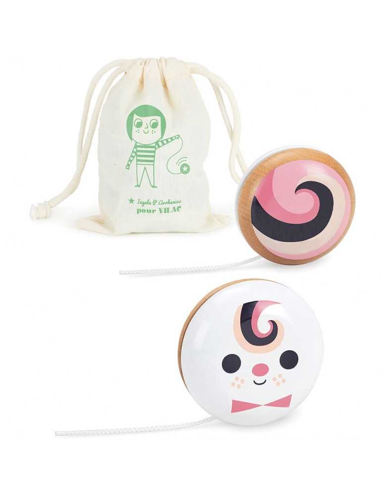 Vilac a confié le design de ce yoyo en bois à l'illustratrice Ingela P.Arrhenius. Elle a imaginé un décor acidulé, aux délicieux accents vintage. Sur la face verte, une chouette ouvre grand ses yeux malicieux. Sur l'autre face, un décor graphique représentant des losanges verts et roses sur fond bleu clair.