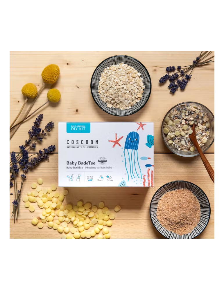 En rappant seulement du beurre de cacao, et en ajoutant du son d’avoine, de la poudre de lait ainsi que des pétales de fleurs, vous obtenez un mélange « infusion de bain » qui prend soin de façon optimale de la peau de bébé.