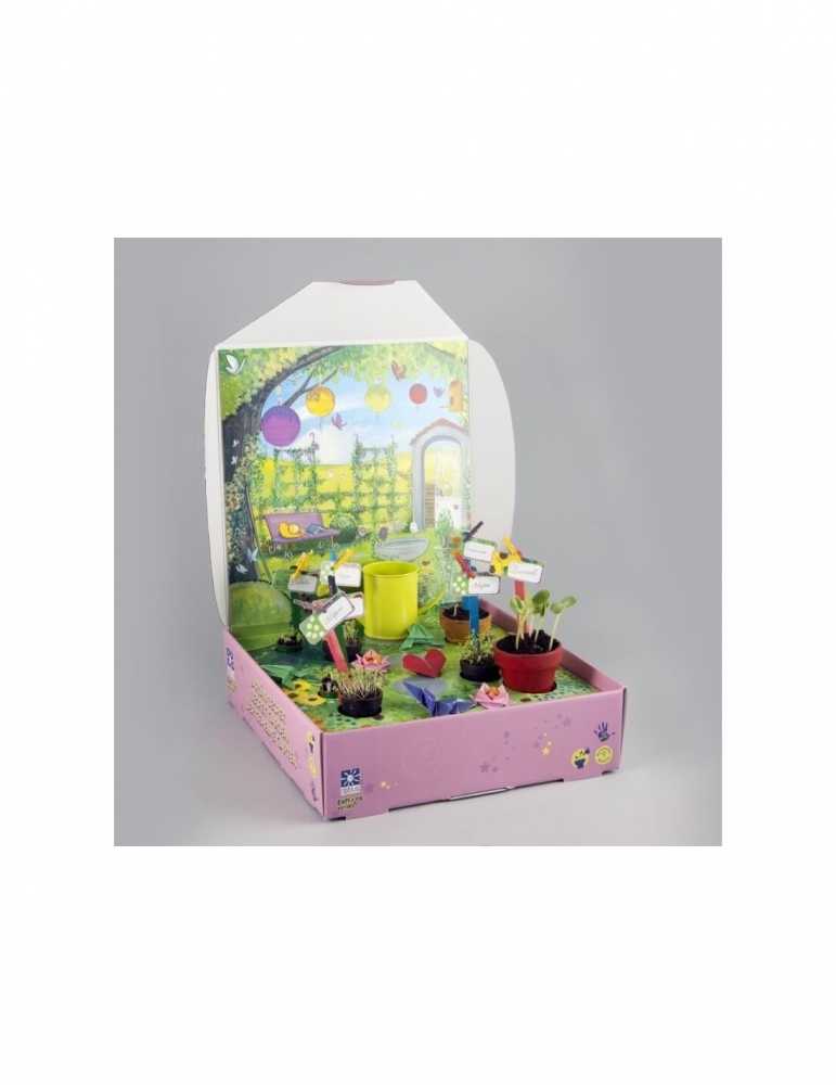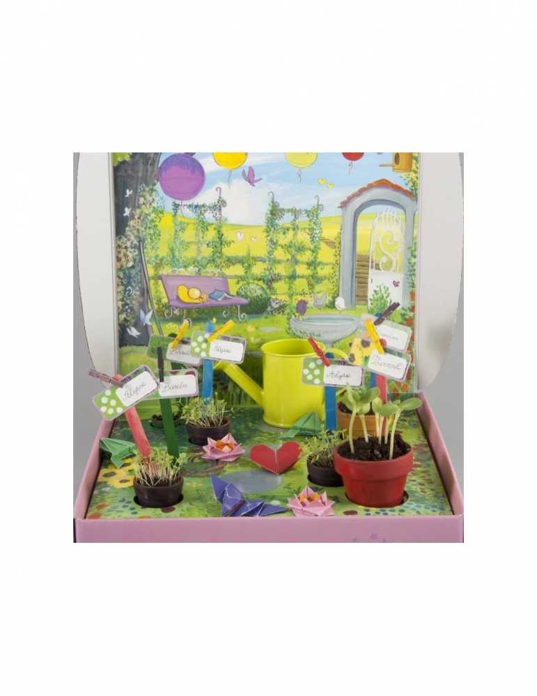 Mon Jardin Secret est un kit de jardinage comprenant tout le nécessaire pour faire pousser ses plantes directement dans la boite : bac étanche, pots de culture, graines à semer, arrosoir, étiquettes de semis et même de la déco !