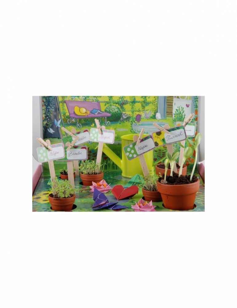 - une planche d'étiquettes de semis à découper pour fixer sur les étiquettes de plantation avec les petites pinces en bois, imprimé en 4 couleurs recto, format 10,5x15 cm,