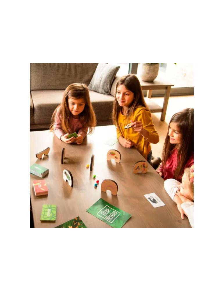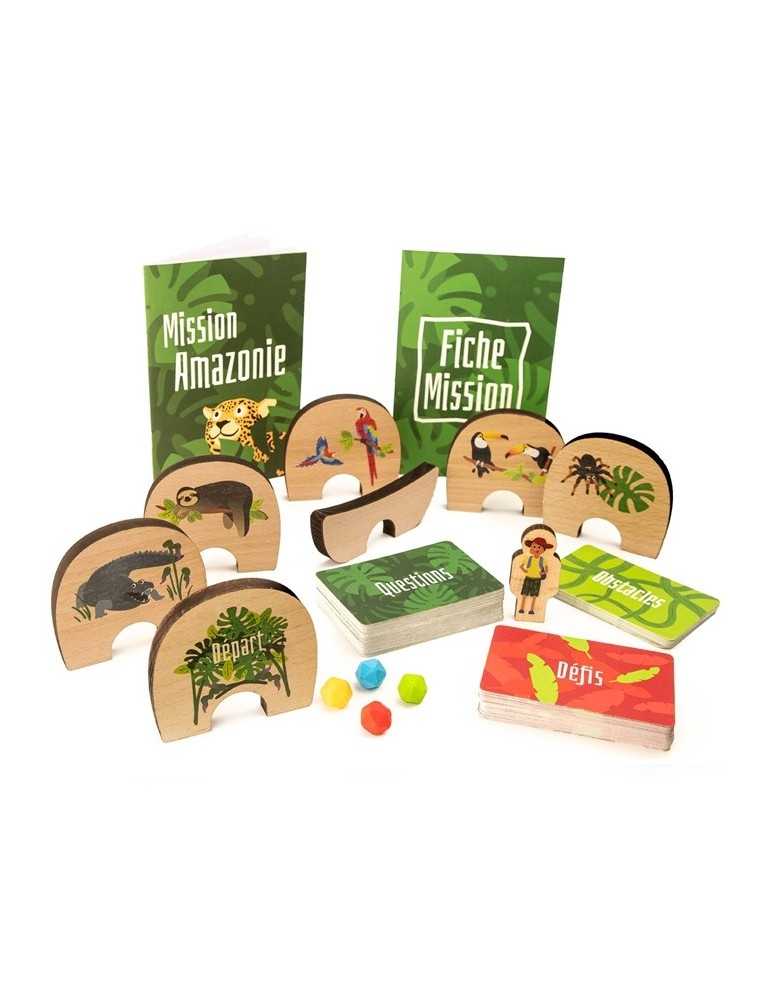 Contenu : 6 arches en bois illustrées au recto et verso - 1 pirogue en bois - 1 explorateur / exploratrice en bois - 40 cartes défis - 50 cartes questions - 16 cartes obstacles - 4 billes en plastique végétal - 1 livret pédagogique de 24 pages pour découvrir et protéger la forêt amazonienne - 1 fiche Mission - 1 code pour obtenir ton diplôme (mais d’abord, tu devras trouver le mot de passe…) - 1 pochon de rangement en coton recyclé