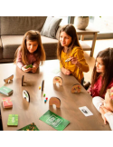 - Matières durables : bois massif du Jura, papier recyclé, encres végétales, plastique végétal, coton recyclé Zéro Déchet (aucun emballage ou suremballage jetable, et le jeu est contenu dans un pochon en polycoton recyclé, avec un motif tissé sans encres)