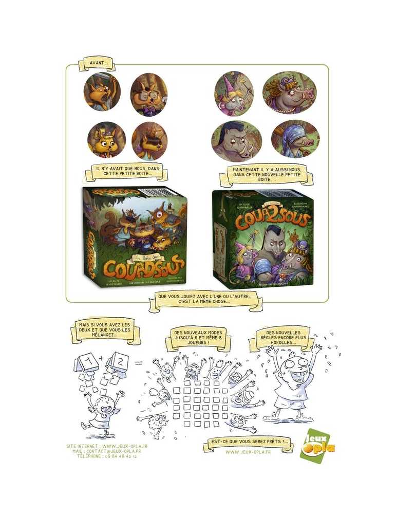 Le Bois des Coua2sous propose la même mécanique de jeu que son grand frère Le Bois des Couadsous, dans un nouveau décor et avec de nouveaux personnages : les Sangliers sont arrivés ! Ainsi, ceux qui n’ont pas le jeu peuvent choisir lequel ils préfèrent, et… Ceux qui ont les deux jeux auront de nouvelles et riches perspectives de jeu !