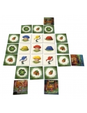 Au milieu, une forêt à traverser, ne contenant que 9 cartes sur lesquelles se trouvent 3 formes (champignon, feuille et caillou) de 3 couleurs différentes (rouge, bleu et jaune).