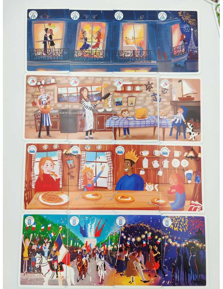 Faites découvrir les fêtes qui rythment le quotidien des Français ! Retrouvez les 4 cartes de chacune des familles pour reconstituer un magnifique paysage, il évoque une fête mise en scène dans une région : la fête nationale à Paris avec le défilé du 14 juillet, le carnaval à Nice, l'épiphanie en Bretagne...