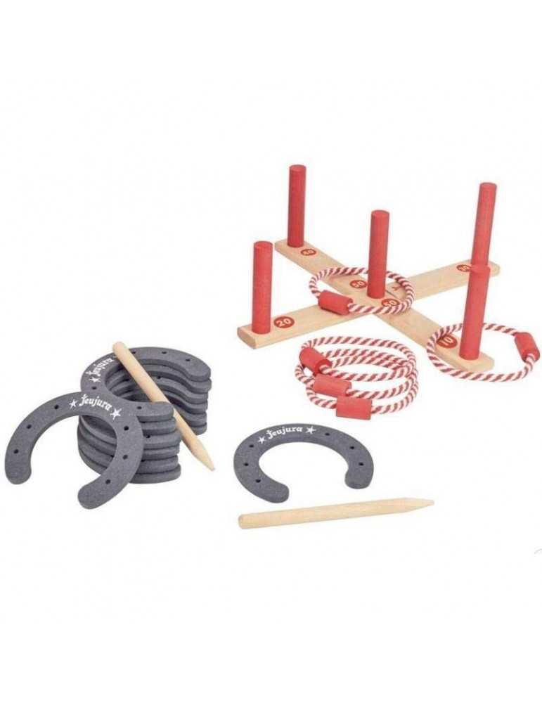 1 support en bois démontable - 5 anneaux en cordelette avec poids - 2 piquets - 8 fers à cheval