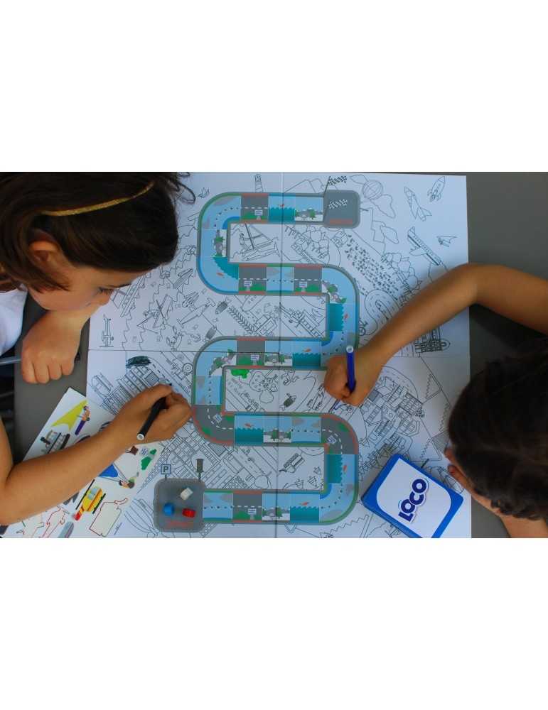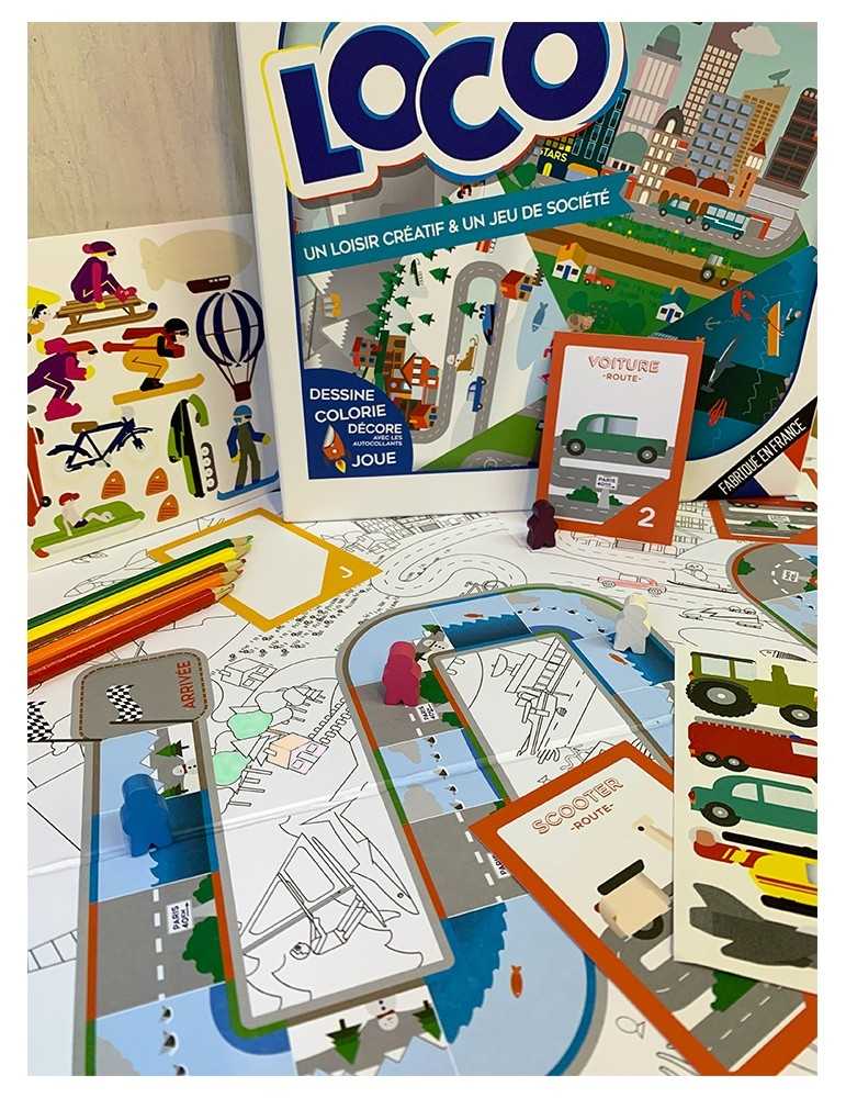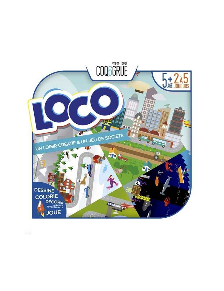 Loco est un jeu de société 2 en 1 qui regroupe un jeu de parcours et une activité manuelle qui permet d'imaginer et dessiner les véhicules pour créer les cartes joker, de décorer les cartes à l'aide des autocollants et de colorier le plateau de jeu selon vos envies !