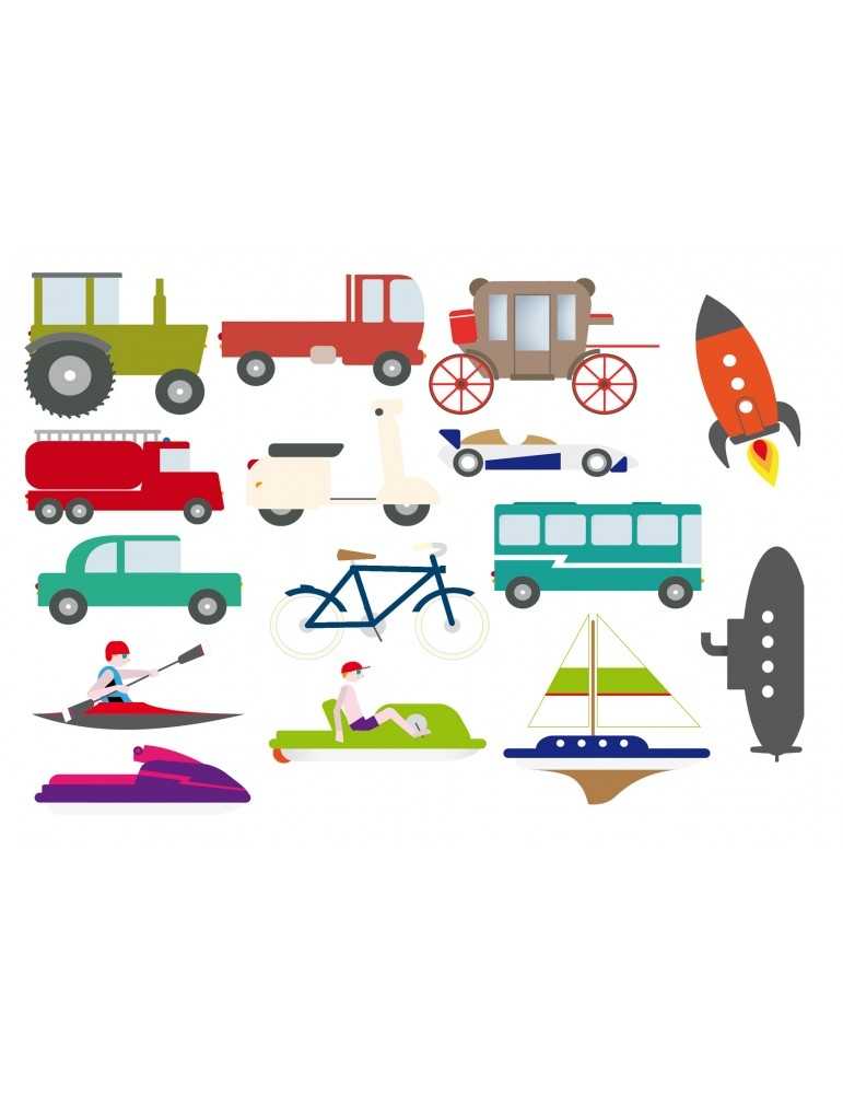 1 plateau à colorier - 5 pions - 2 planches d'autocollant - 32 cartes décorées - 32 cartes à décorer - 10 cartes joker à dessiner - 8 cartes intempéries - 1 livret explicatif sur les moyens de locomotion
