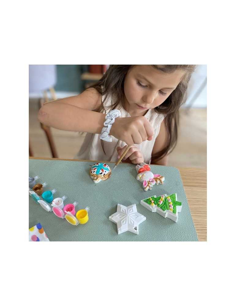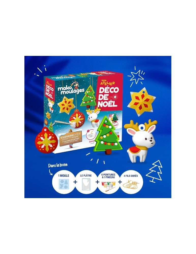 Cet atelier créatif mako déco de Noël contient 4 formes décorative adorables sur la thématique de Noël: un joli sapin, une étoile, une boule de noël et un renne trop mignon. On les peint avec les peintures de fête nacrées, dorées et argentées, avant de les suspendre grâce aux fils dorés inclus ! Grande joie de participer à la décoration de la maison en cette période de fêtes familiales !