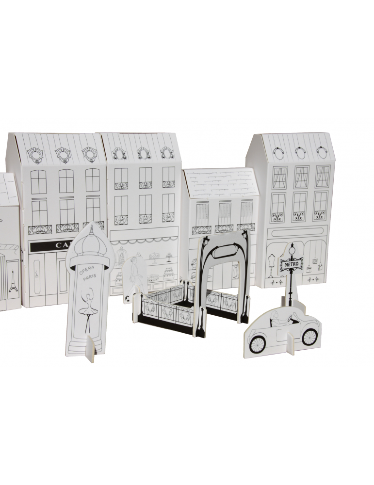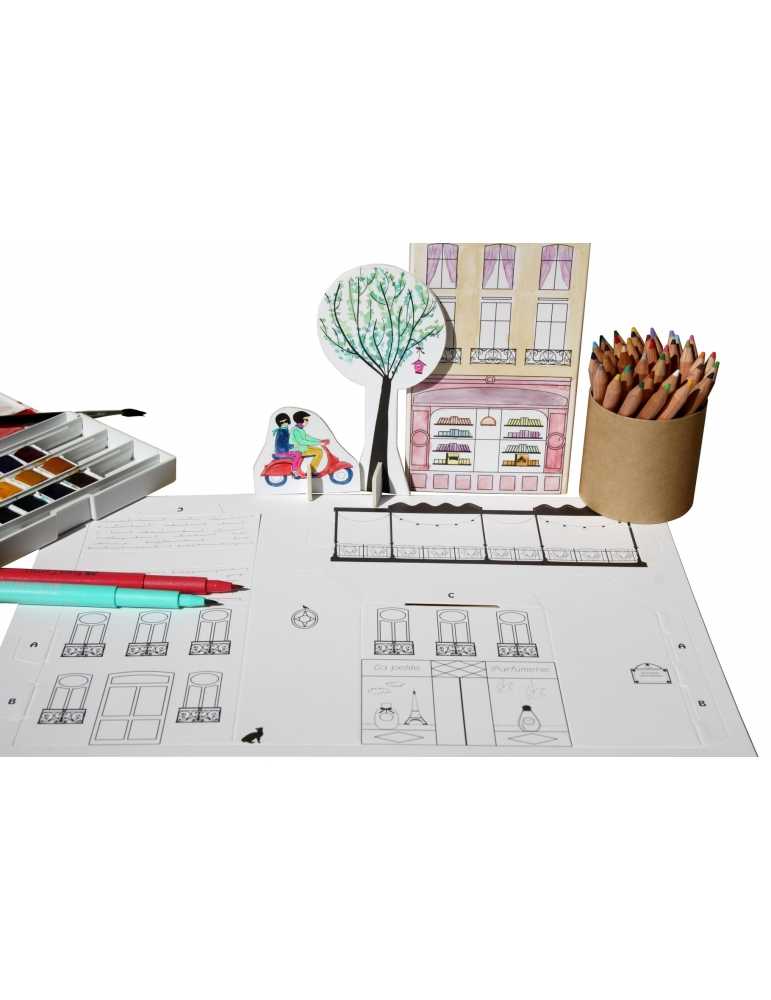 Les maisons de Paris à colorier et construire sans colle ni ciseaux et des personnages, véhicules, mobilier urbain à disposer pour l'animer et jouer