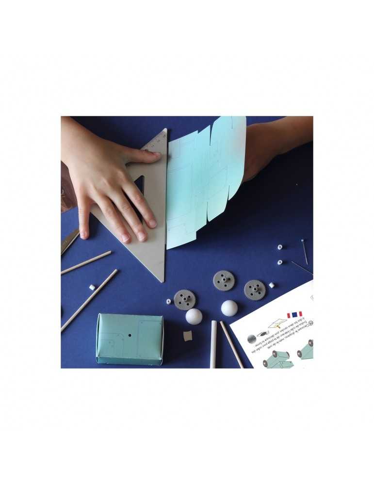 2 boites prédécoupées - 2 tiges de bois courtes - 1 tige de bois longue - 4 roues dentées - 5 rondelles blanches - 2 demi boules de polystyrène - 2 épingles à tête ronde - 1 carré de pâte adhésive - 1 planche autocollante décor - 1 livret illustré de 24 pages - 1 joli autocollant sur le thème de l'espace