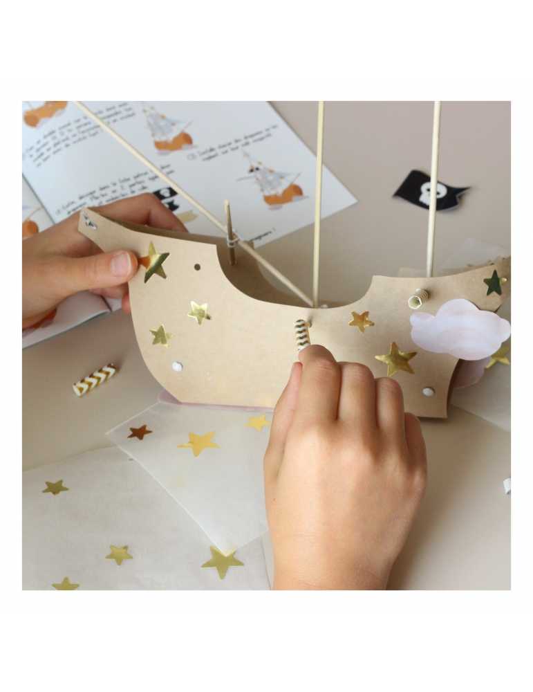 Grâce à ce kit créatif les enfants vont partir à la découverte du conte de Peter Pan ! Dans cet atelier, les enfants créent une maquette de bateau qui navigue à travers les nuages, qu’ils pourront accrocher à leur plafond dans leur chambre. Ce kit contient également un livret illustré !