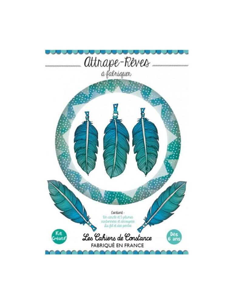 Ce kit contient cinq plumes, un cercle cartonné, du fil et des perles pour réaliser un attrape-rêves bleu décliné en camaïeu. Imprimé au recto et au verso, il peut aussi servir de mobile. D'ailleurs, il fera un beau cadeau déco fait main.