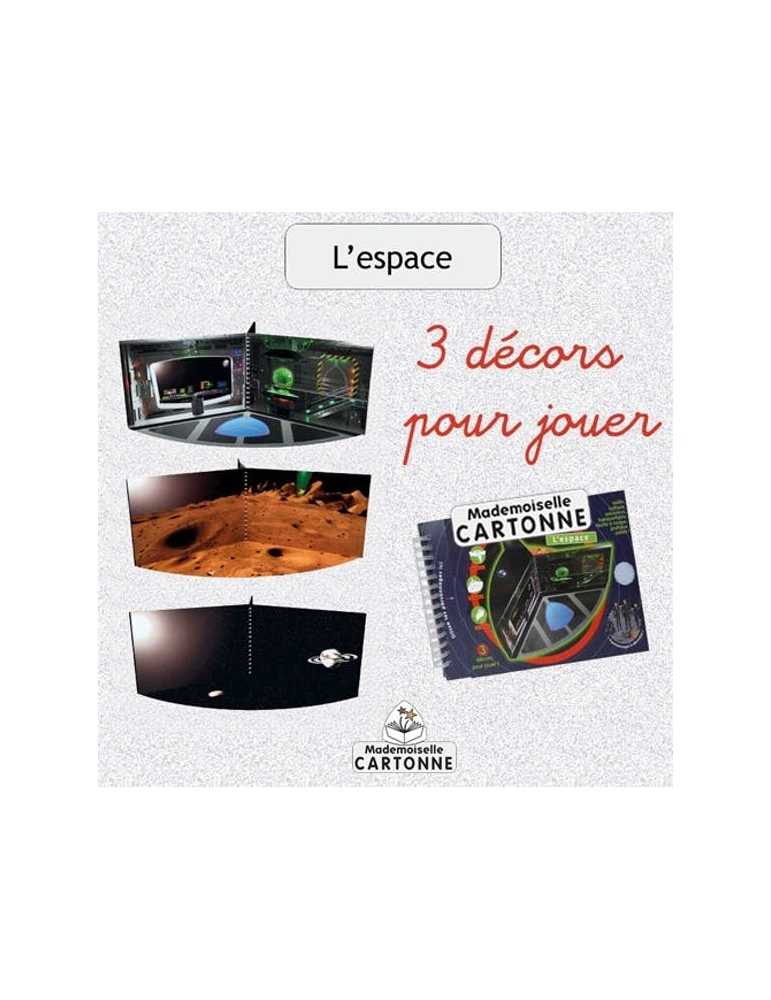 3 jolis décors robustes sur le thème de l'Espace pour s'imaginer des histoires à l'infini avec toutes les petites figurines que les enfants possèdent (inclus carte de personnages en carton à découper).