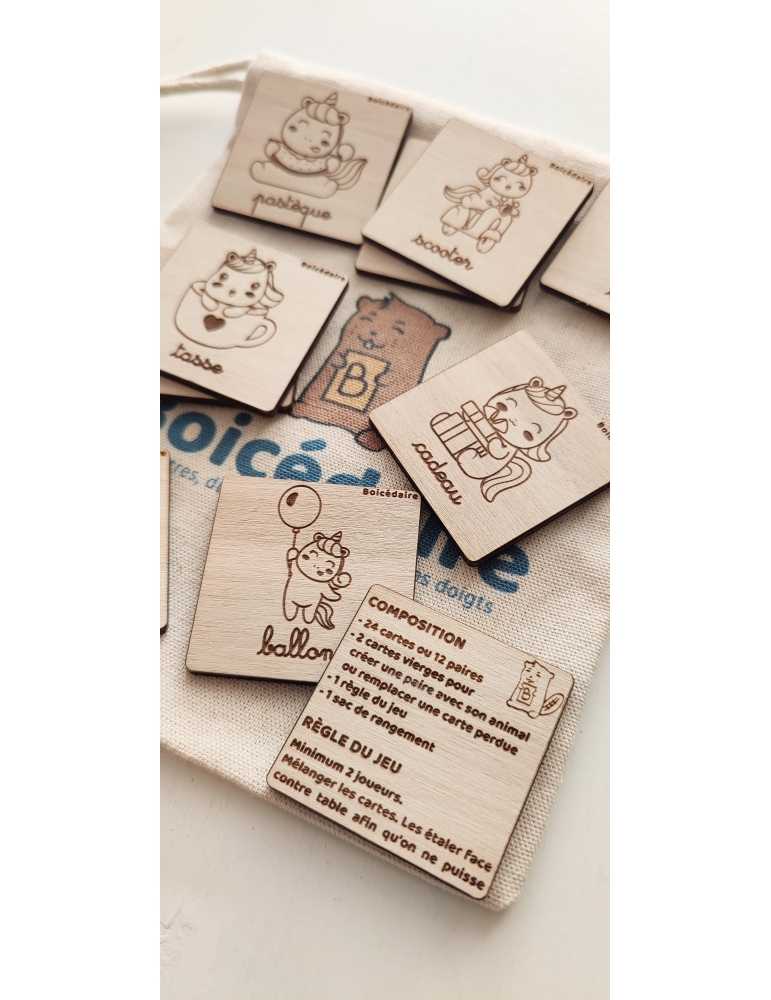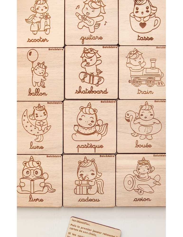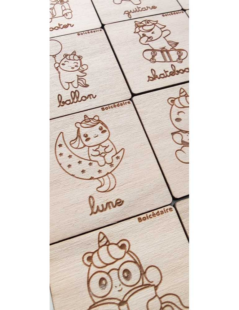 Mélanger les cartes en bois. Les étaler face contre table afin qu'on ne puisse pas les identifier.