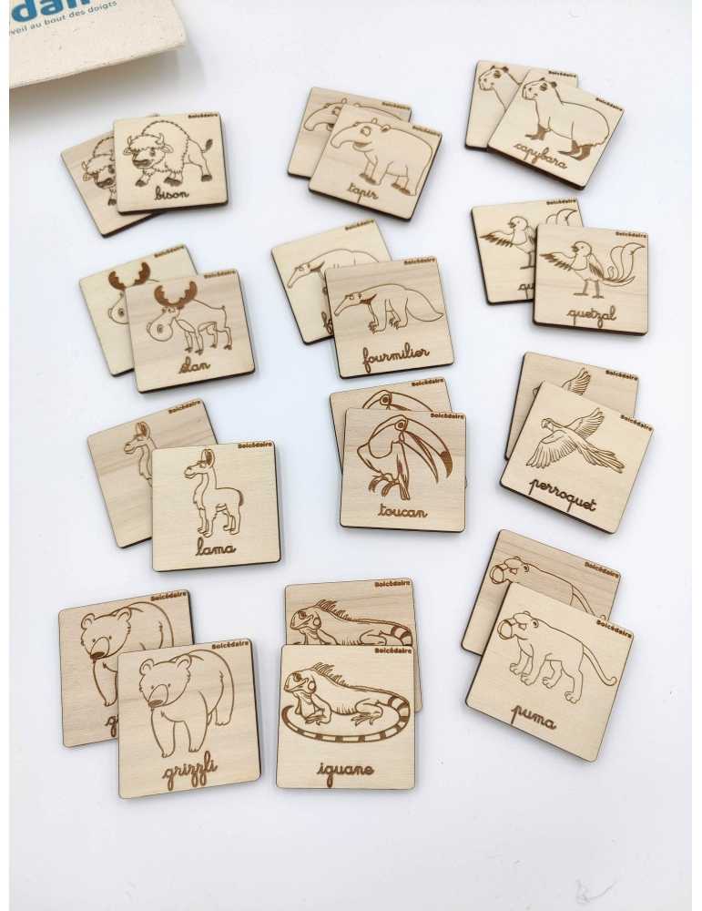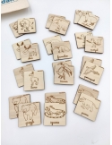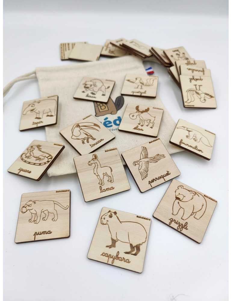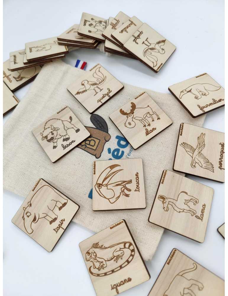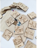 Mélanger les cartes en bois. Les étaler face contre table afin qu'on ne puisse pas les identifier.