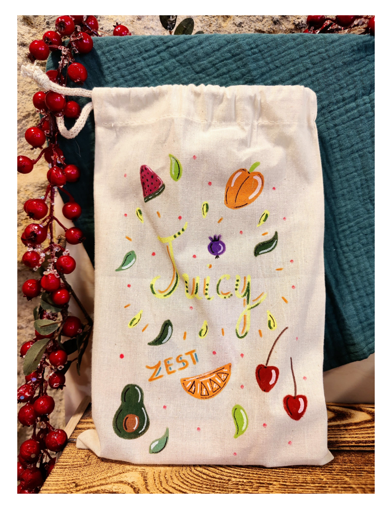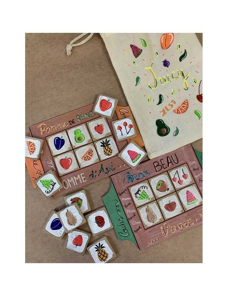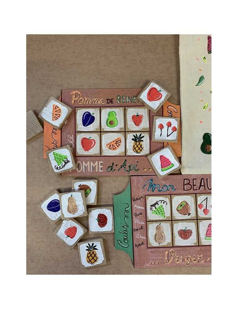 Bois, peinture acrylique, tissu, vernis adapté aux enfants