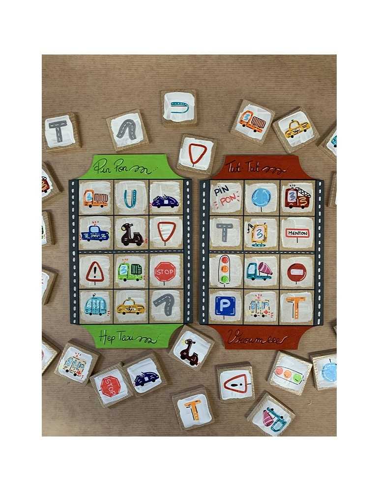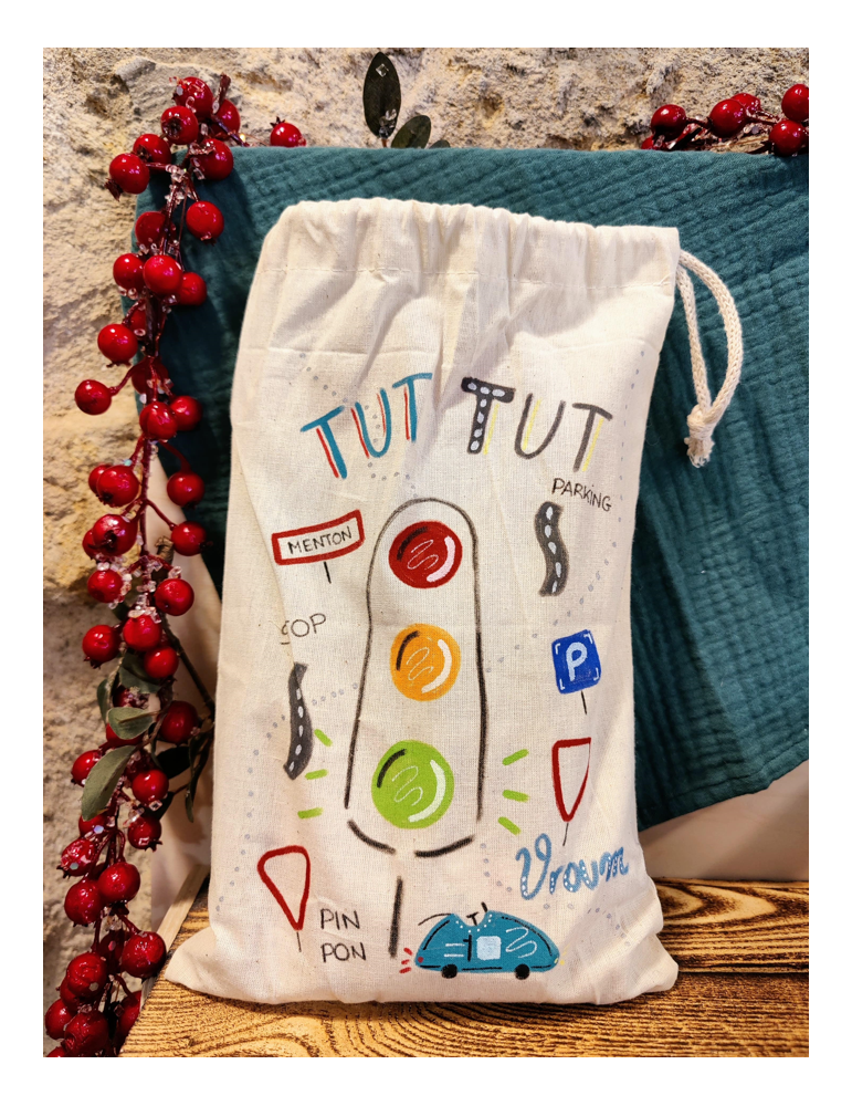 Bois, peinture acrylique, tissu, vernis adapté aux enfants