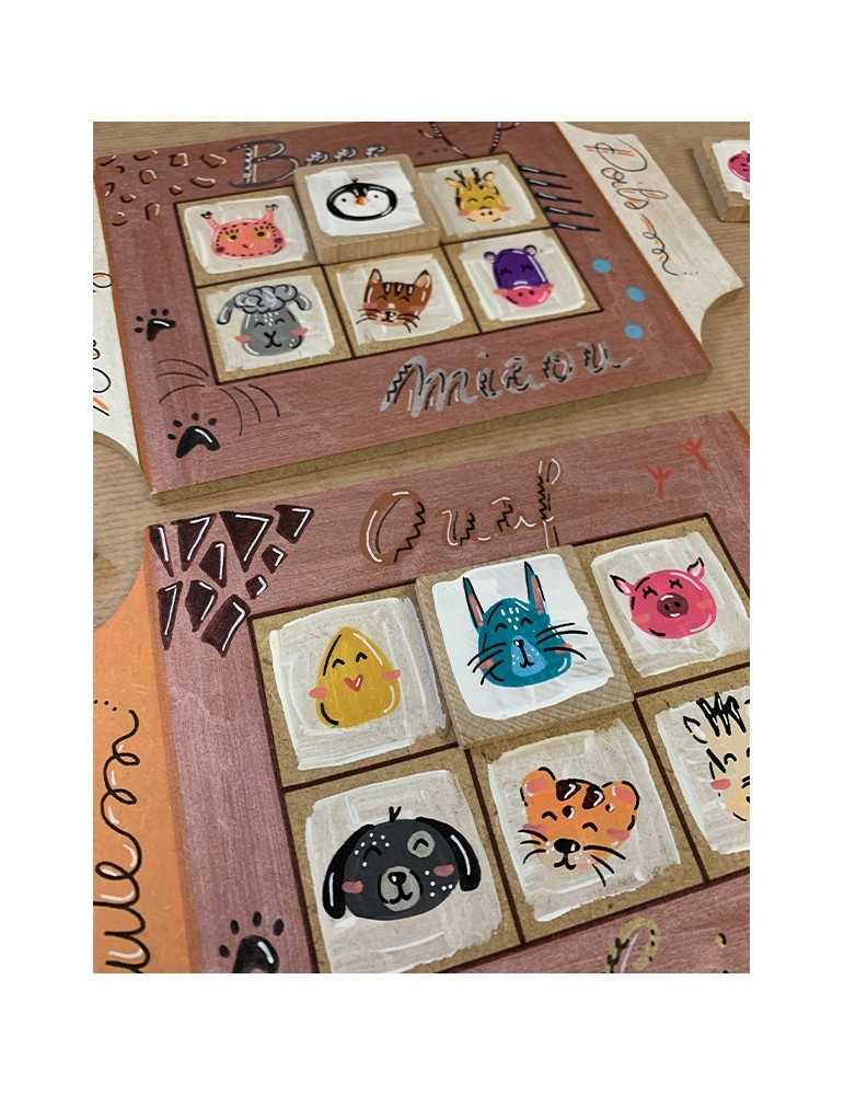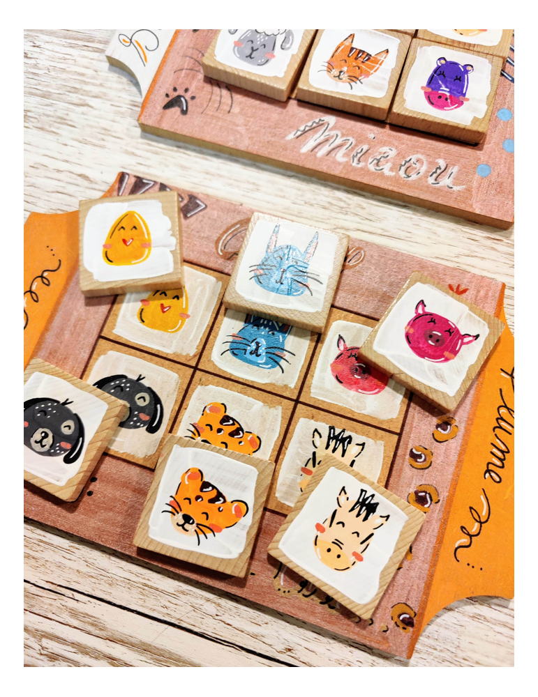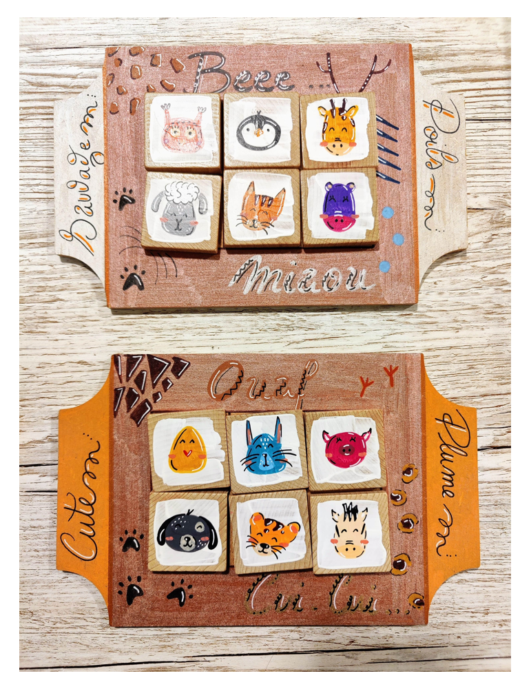 Bois, peinture acrylique, tissu, vernis adapté aux enfants