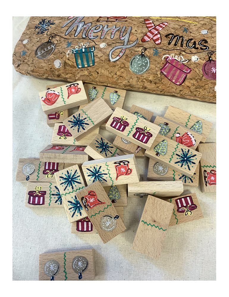 Bois, peinture acrylique, tissu, vernis adapté aux enfants