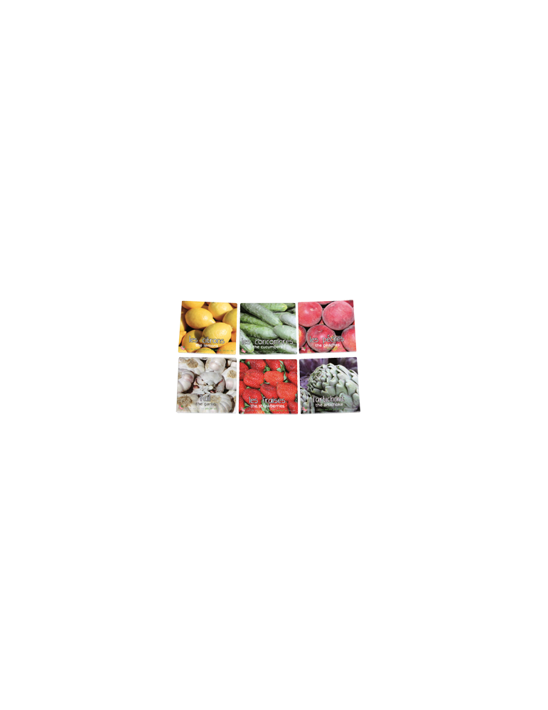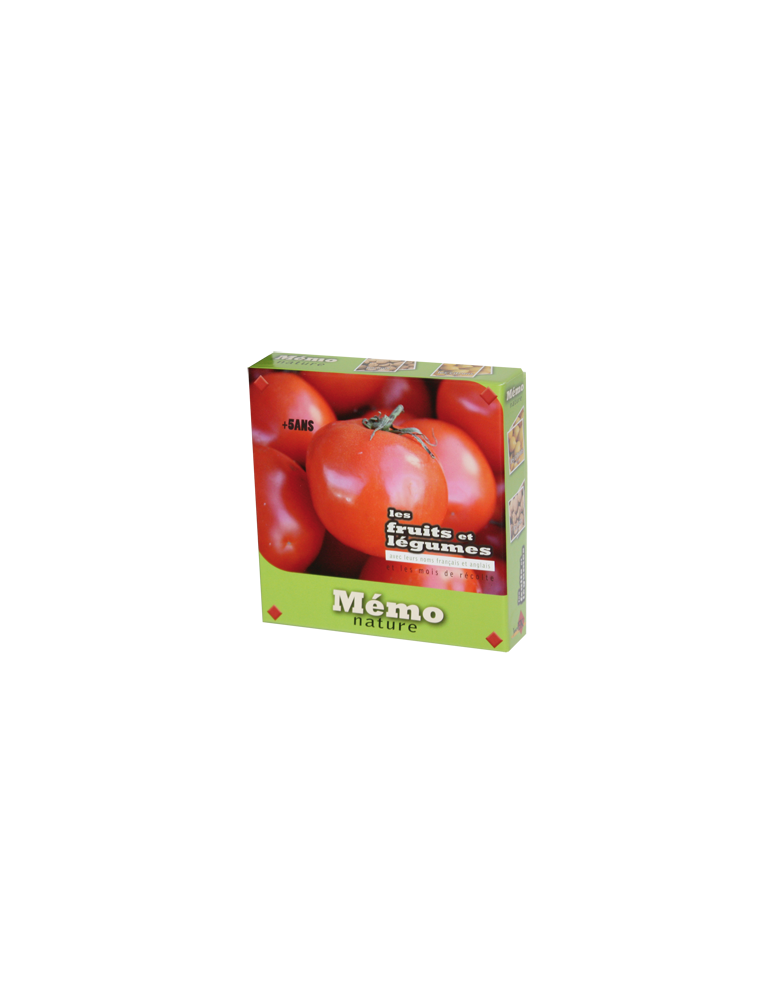 Jeu de mémory avec des photos des fruits et de légumes, sur chaque carte il y a le nom du fruit/légume en français et en anglais ainqi que la période de récolte.