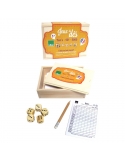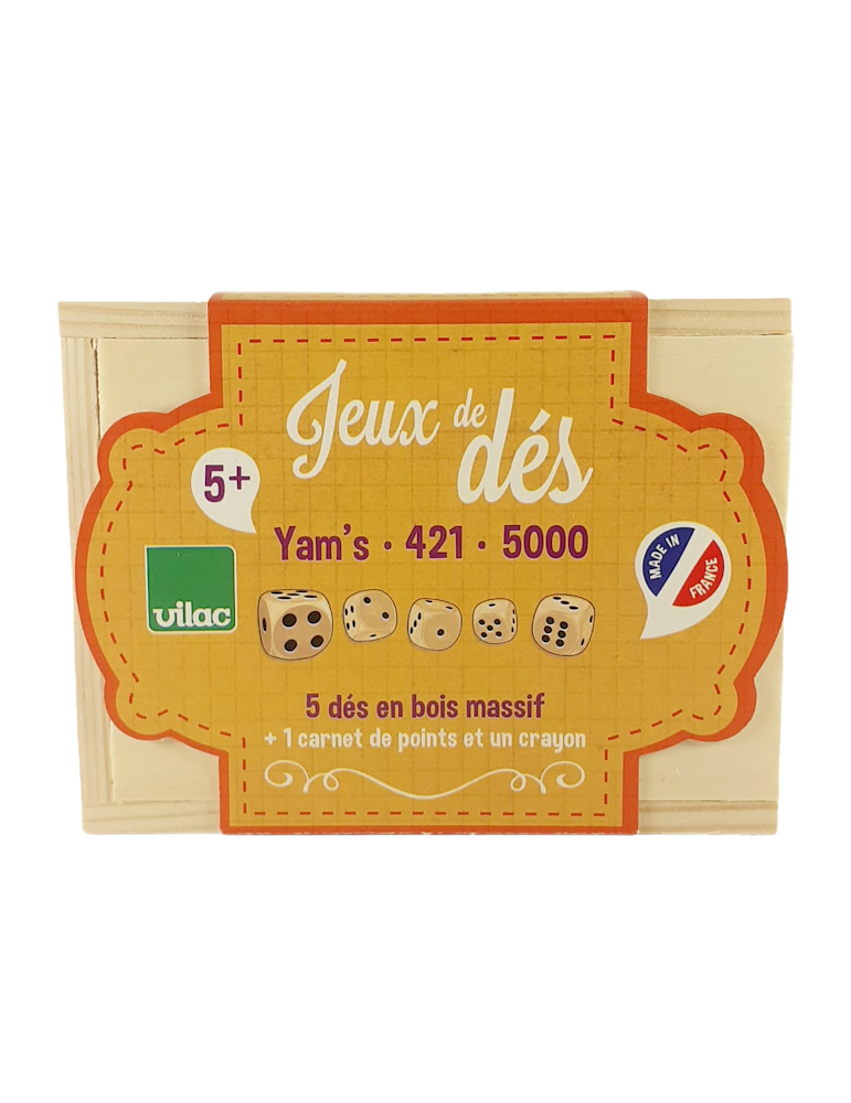 Ce coffret en bois contient cinq dés en bois, une feuille pour noter les points, un crayon et une règle du jeu en plusieurs langues.