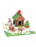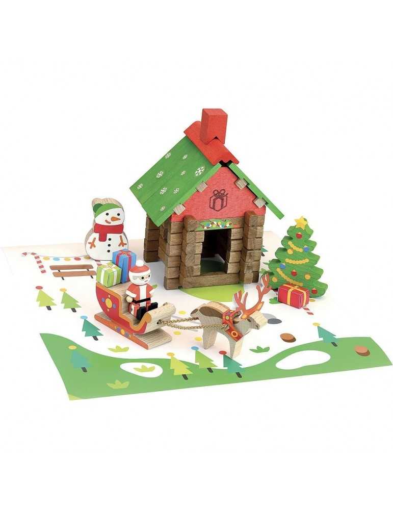 La maison du Père Noël - jeu de construction, 50 pièces : en bois naturel et teinté avec une notice de montage, un tapis de jeu et de nombreux accessoires.