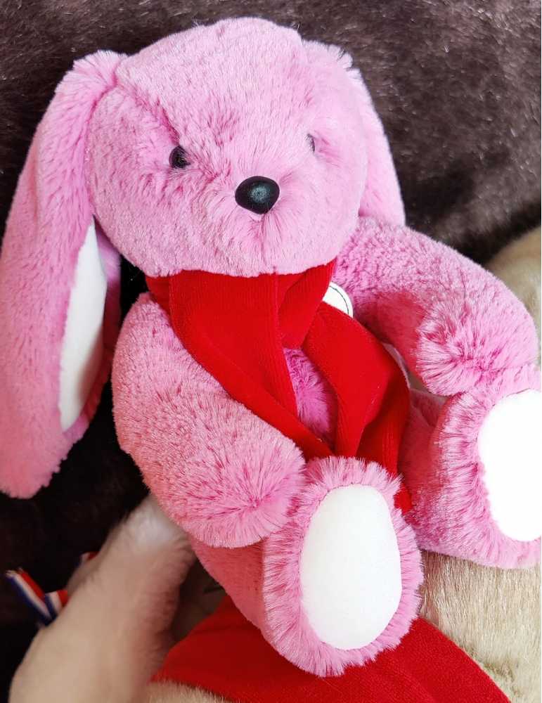 Magnifique peluche lapin fuchsia, cousue main et numérotée. Fabriquée en France.